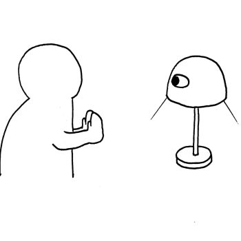Diese Tischlampe bringt die soziale zwischenmenschliche Interaktion in die Beziehung zwischen Menschen und Nicht-Menschen. Hier sind Lampe und Mensch gleich.